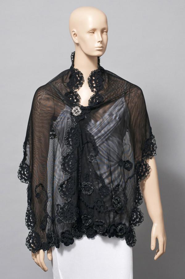 Chal en tul elastizado doble, trabajado con flores en negro y plata. Cierra con prendedor plata y strass. Medidas: Largo: 135 cm. Ancho: 40 cm.